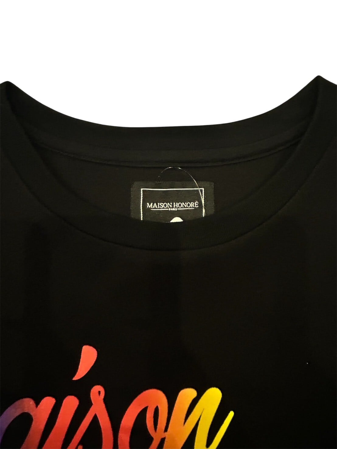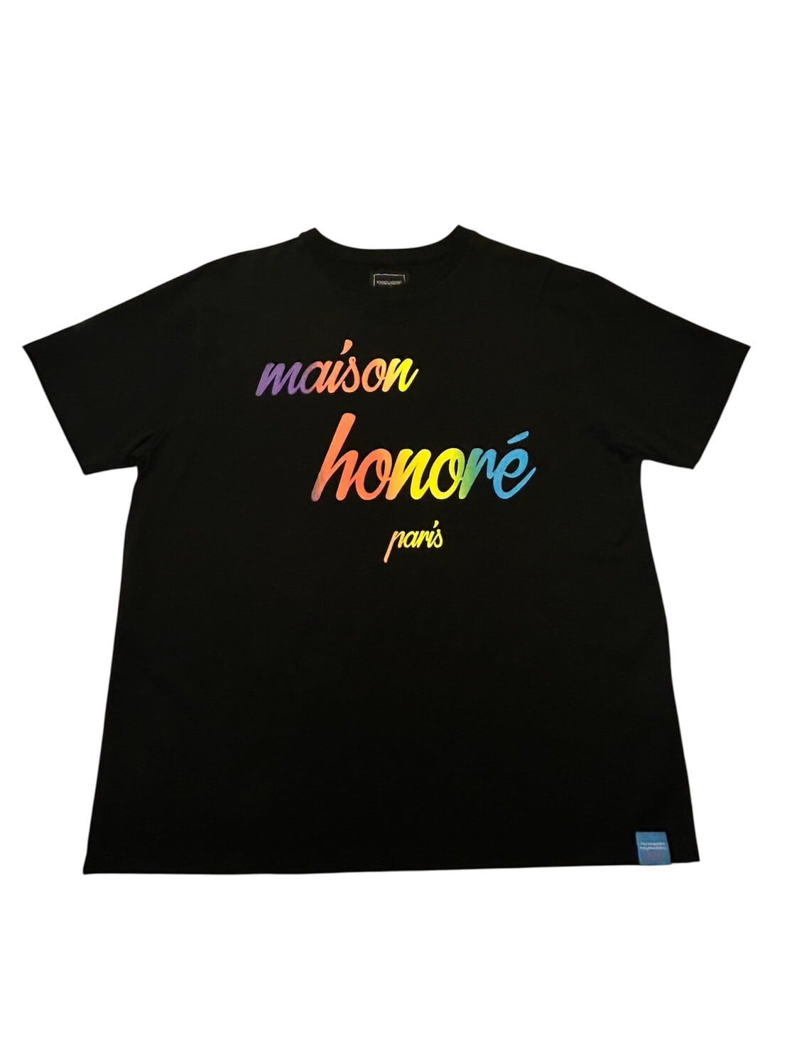 白地のTシャツに「maison honoré paris」のロゴがレインボーカラーでプリントされています。
