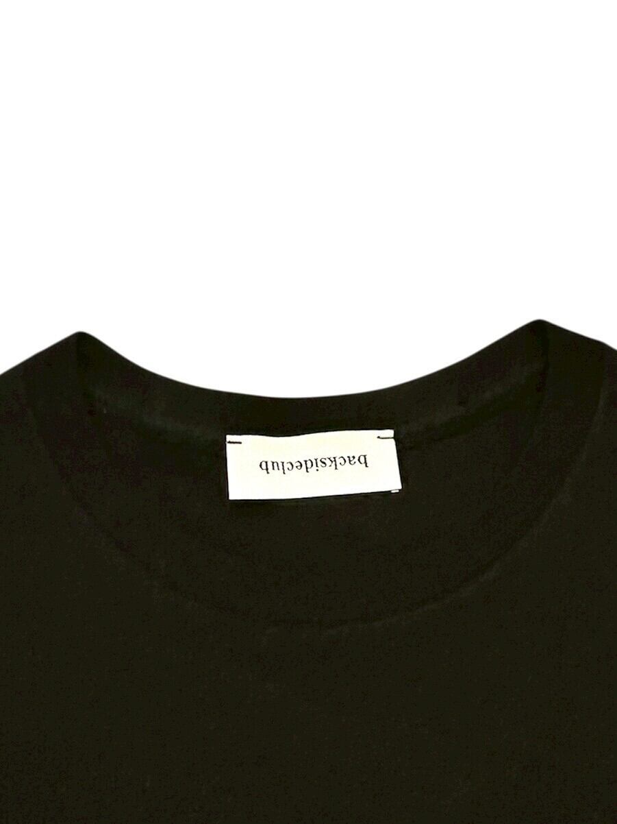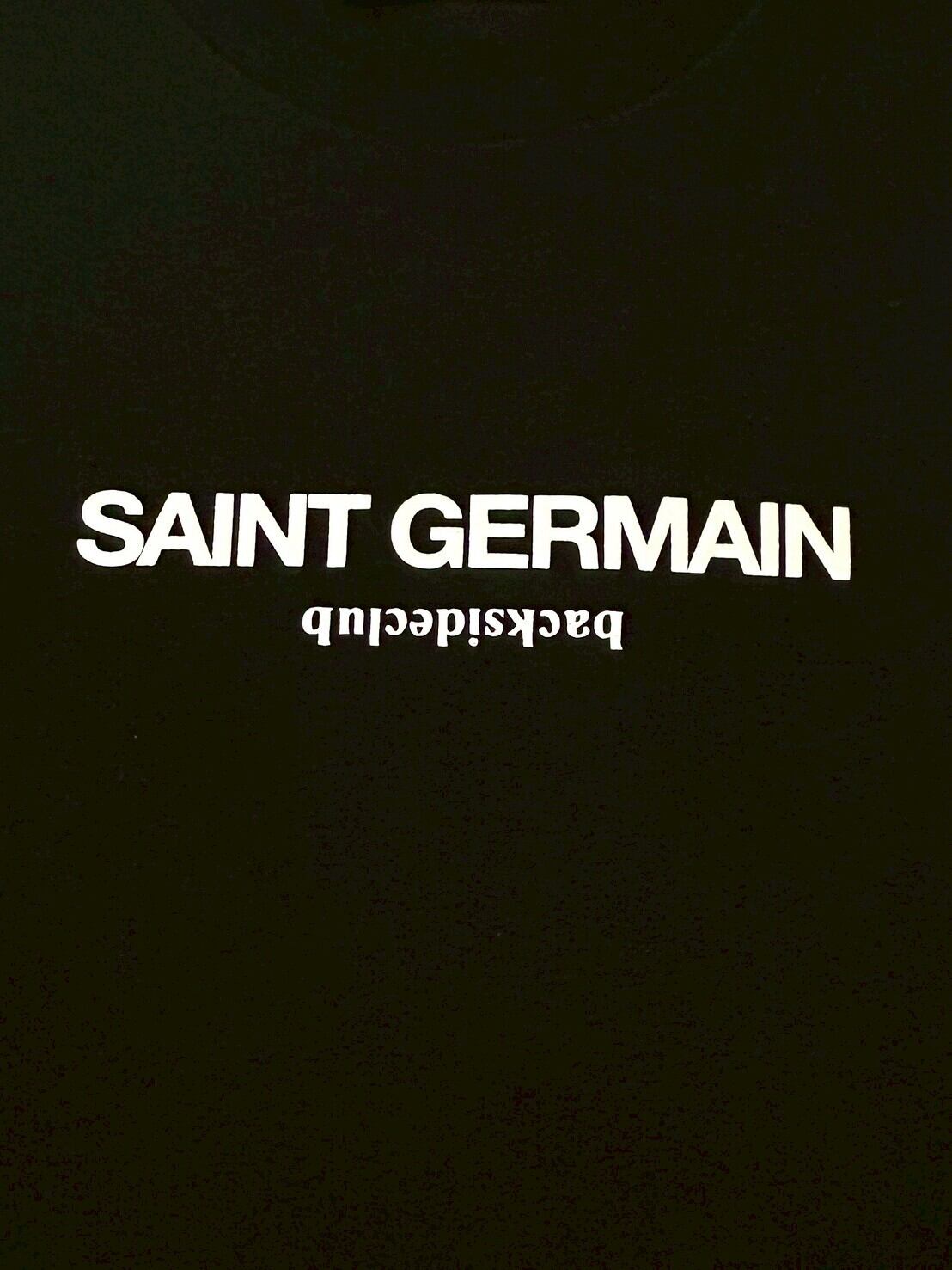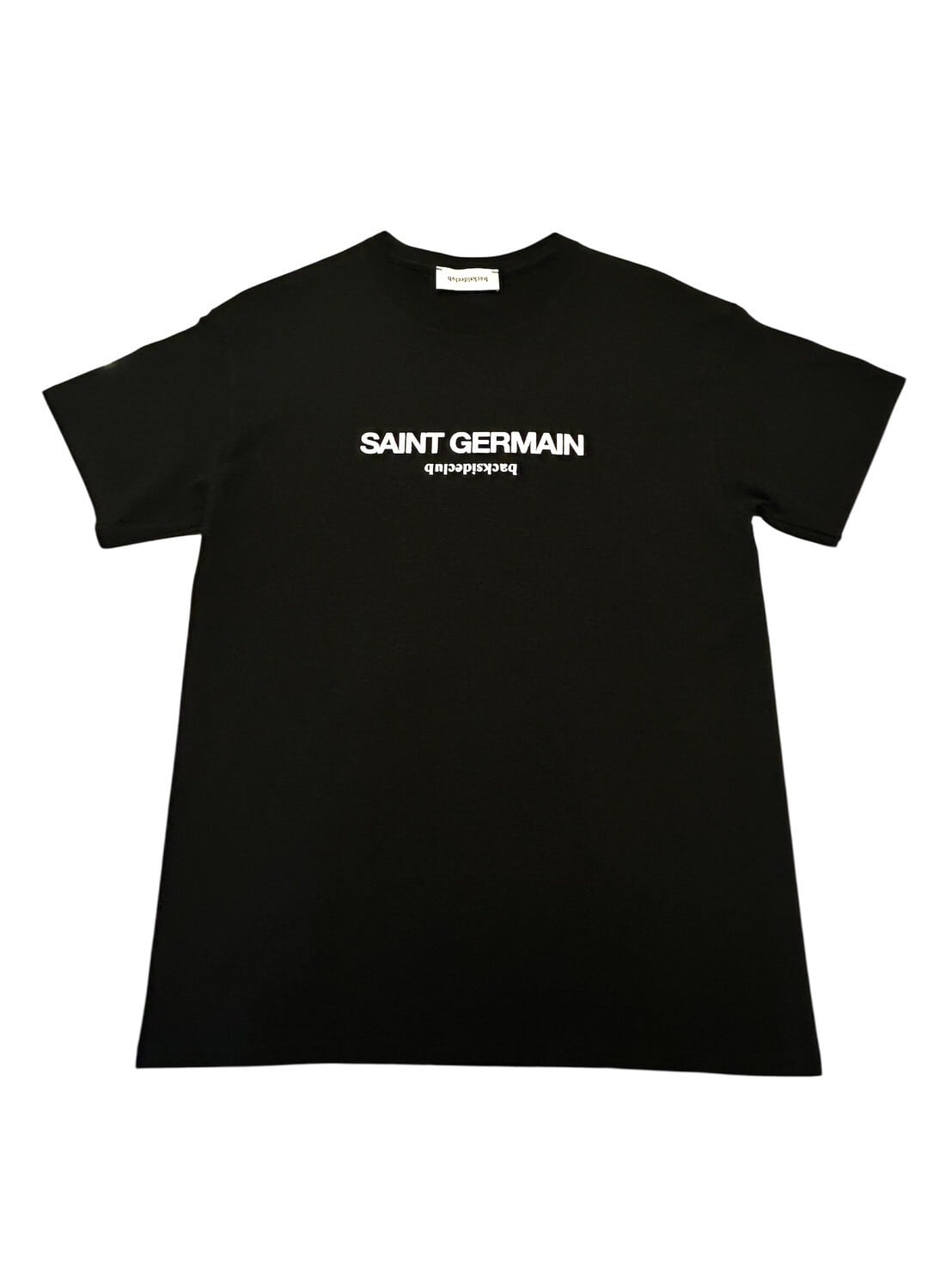 黒色の生地に「SAINT GERMAIN」の文字が中央に大きくプリントされており、首元にはブランド名である「backsideclub」が逆さまに印字されています。
