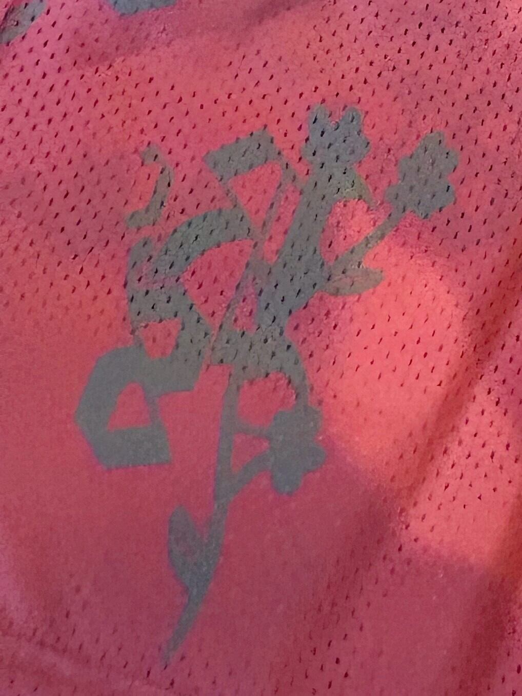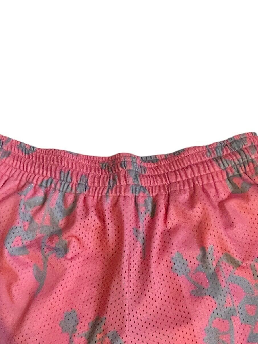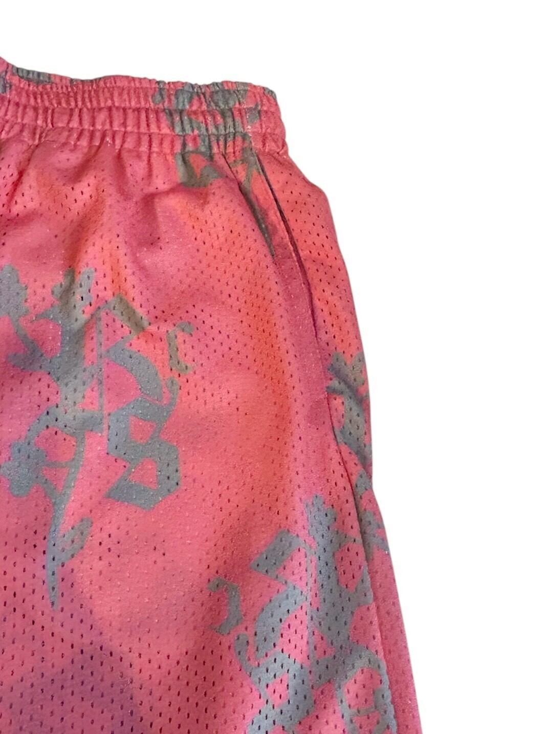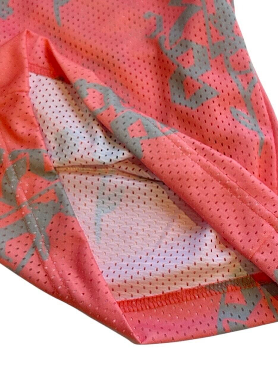 通気性の良いメッシュ素材を使用し、鮮やかなピンク色にグレーの抽象的な模様があしらわれています。