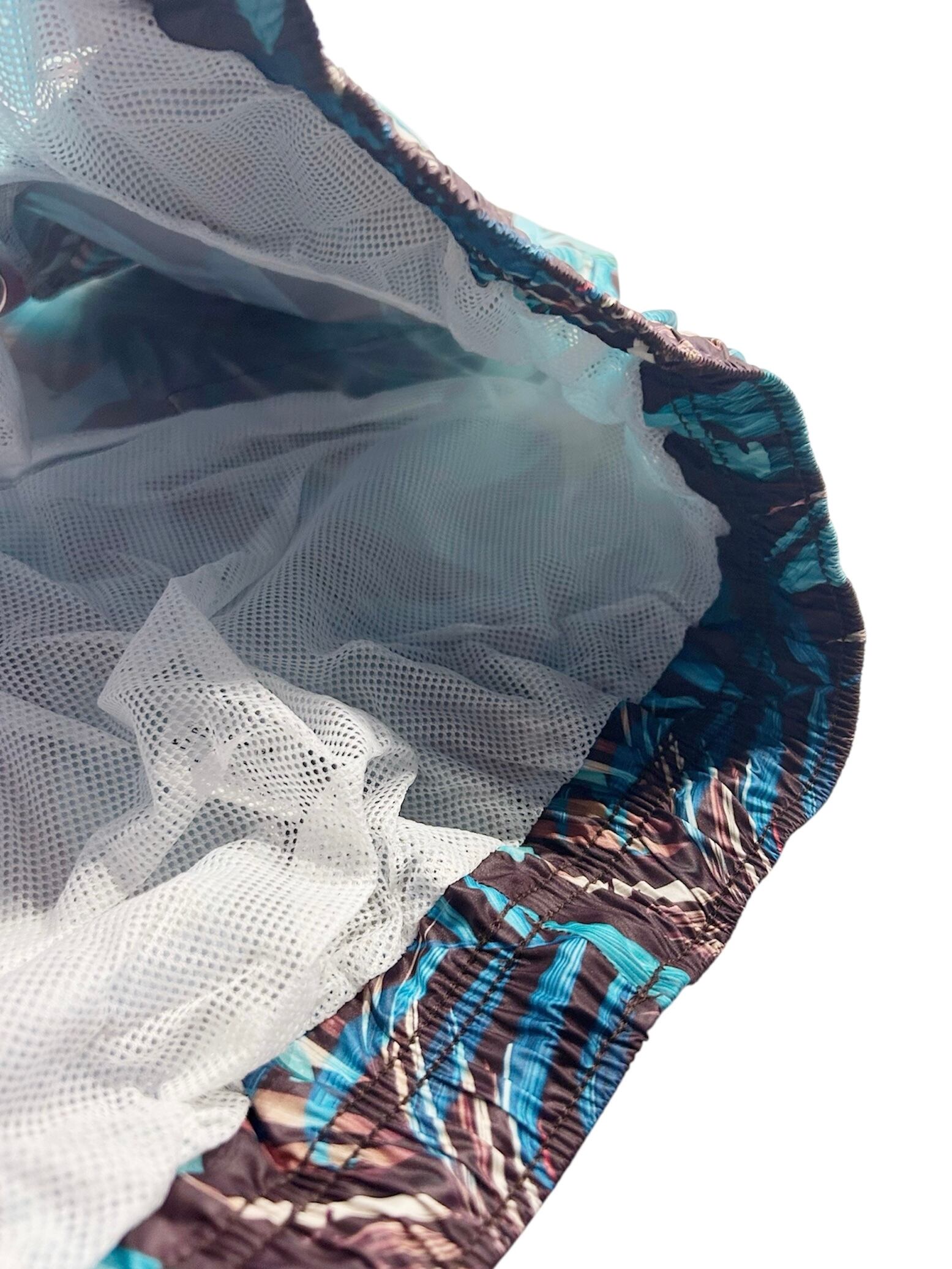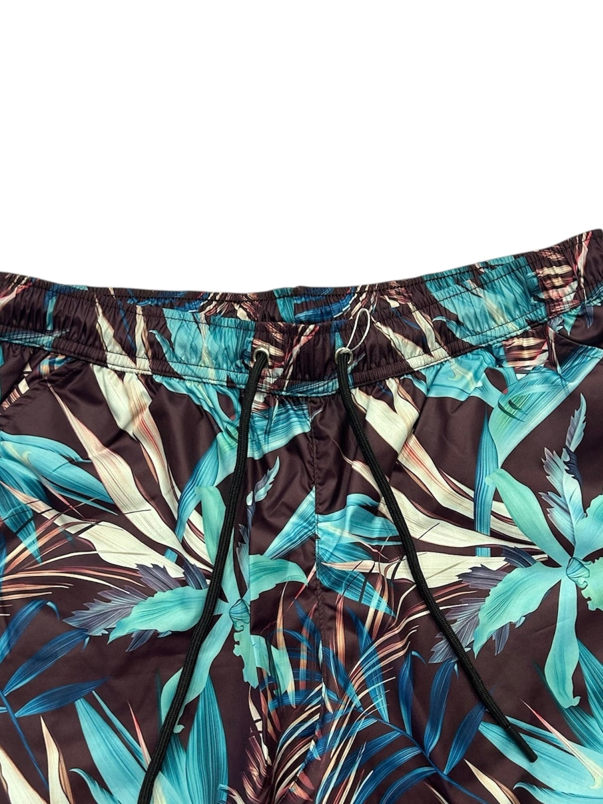落ち着いたダークトーンをベースに、鮮やかなブルーやグリーンのリーフ柄がプリントされたリゾート感のあるデザインです。