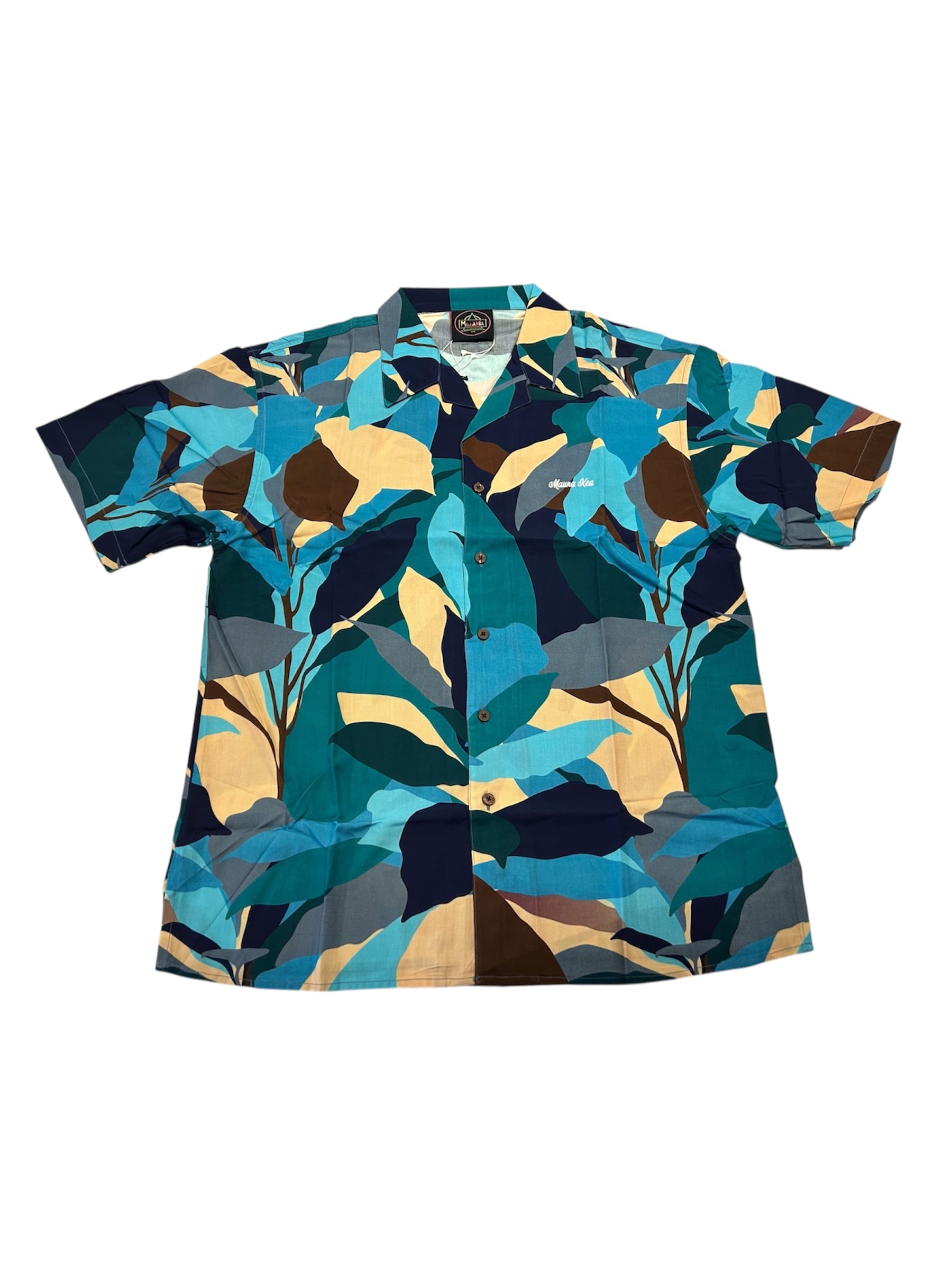 青、水色、ベージュ、茶色などが複雑に組み合わさったアブストラクト柄(抽象柄)やボタニカル柄が特徴的なオープンカラー(開襟)シャツです。