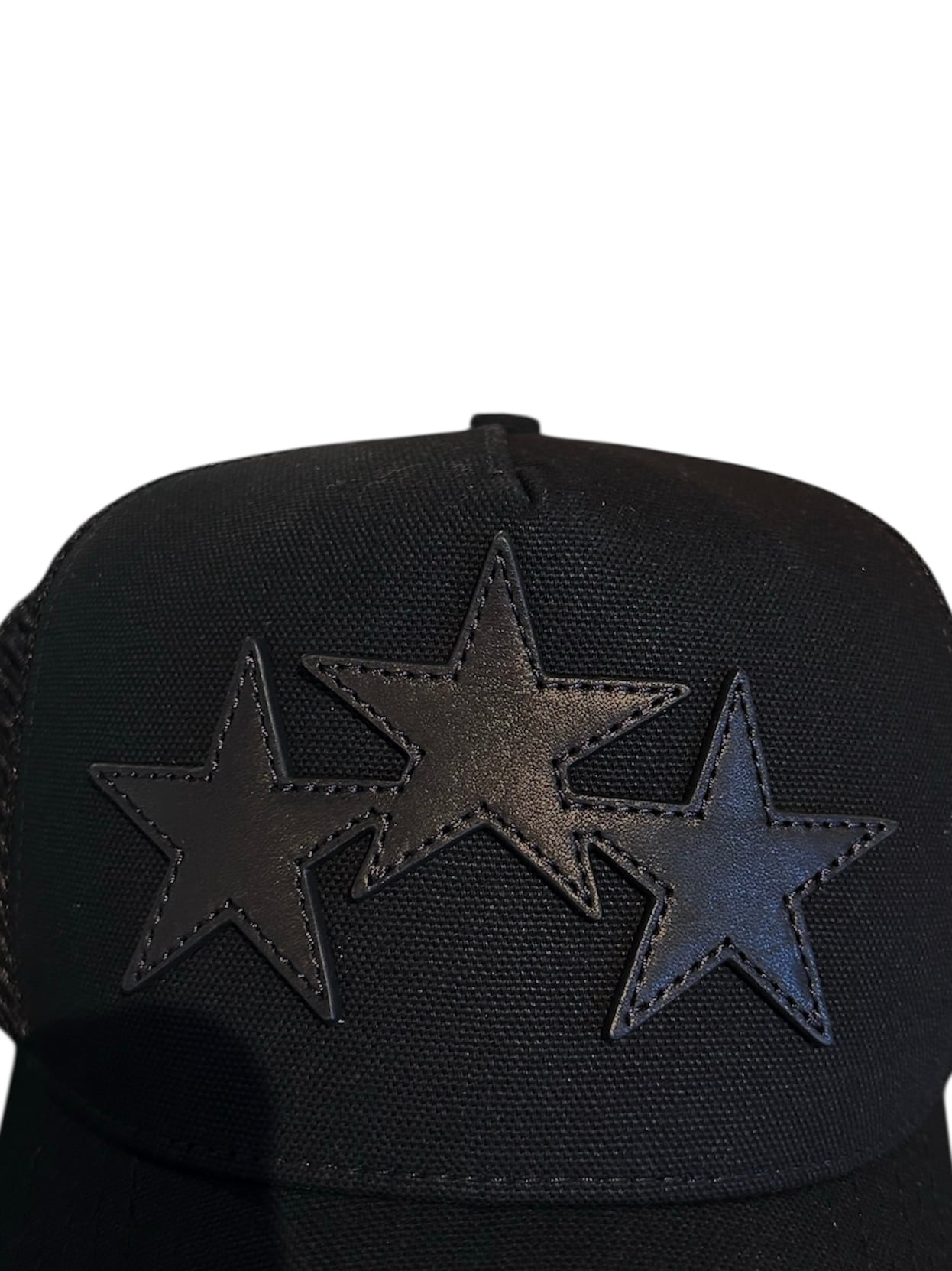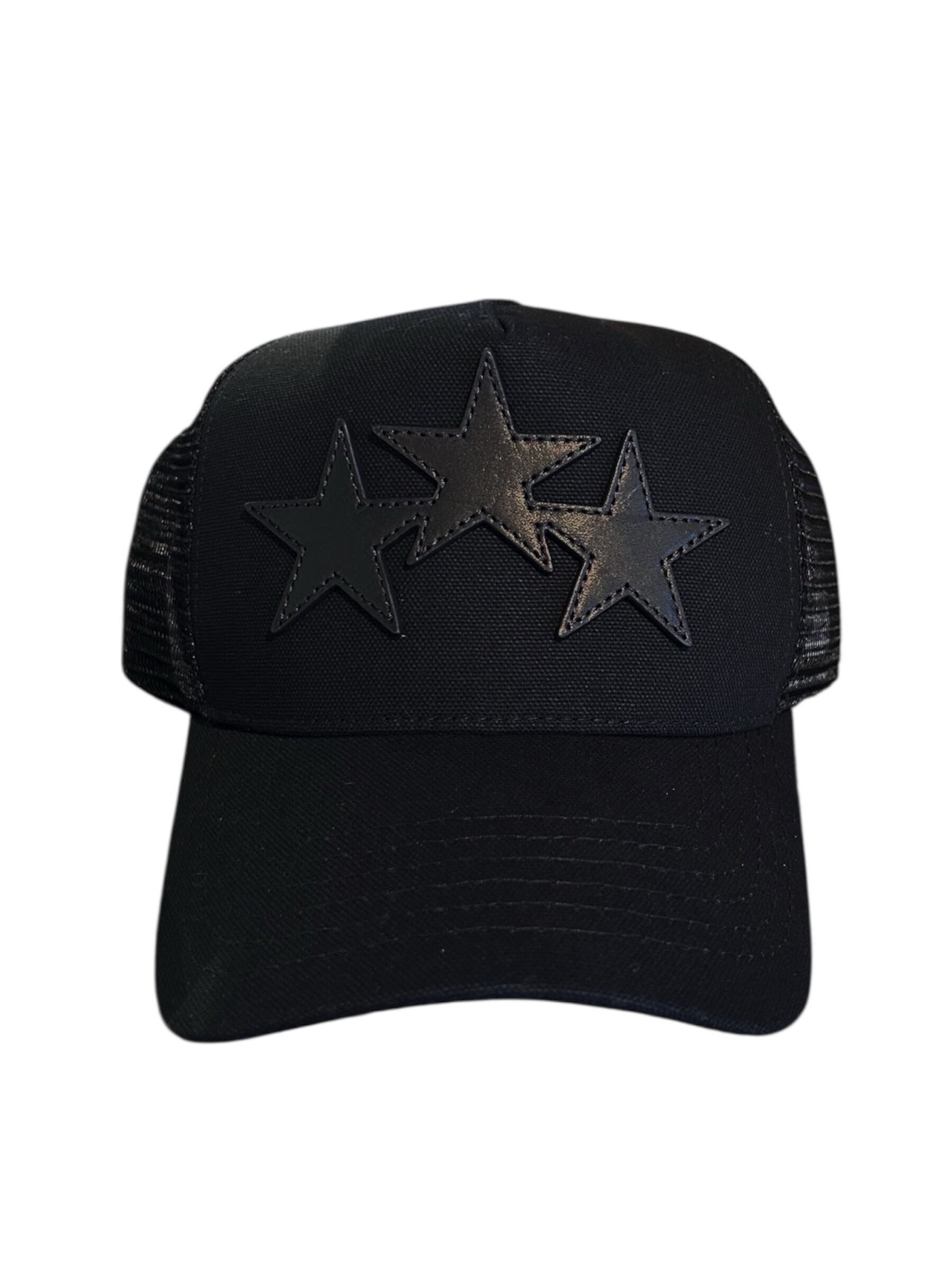 3つ星のディテール、カーブしたつば、ダブルスナップバック留め具が特徴のトラッカーハット