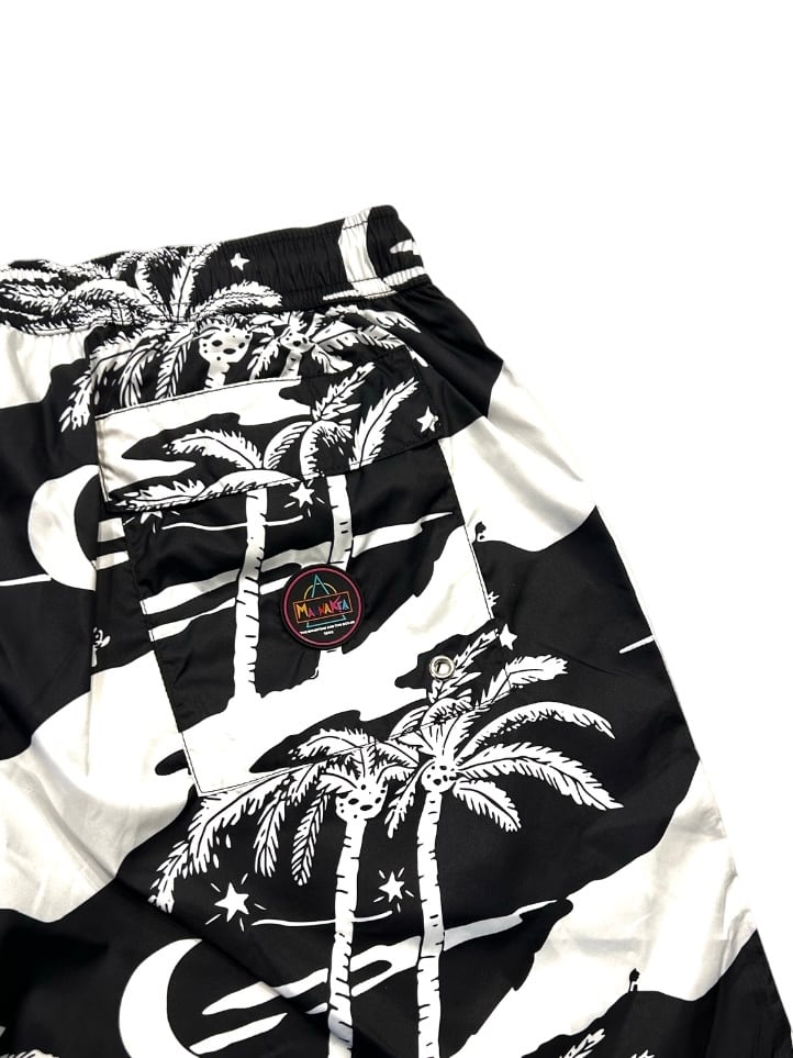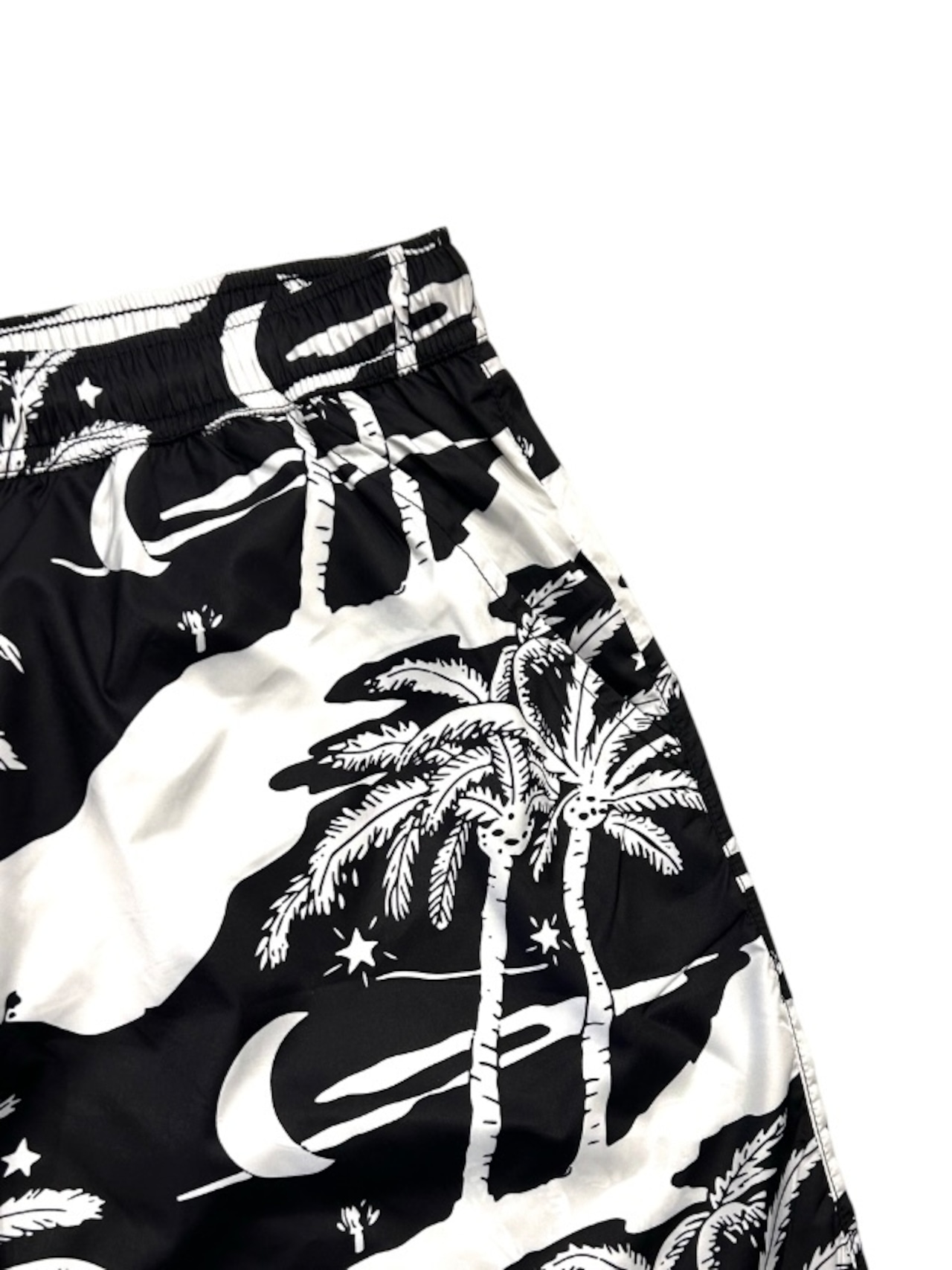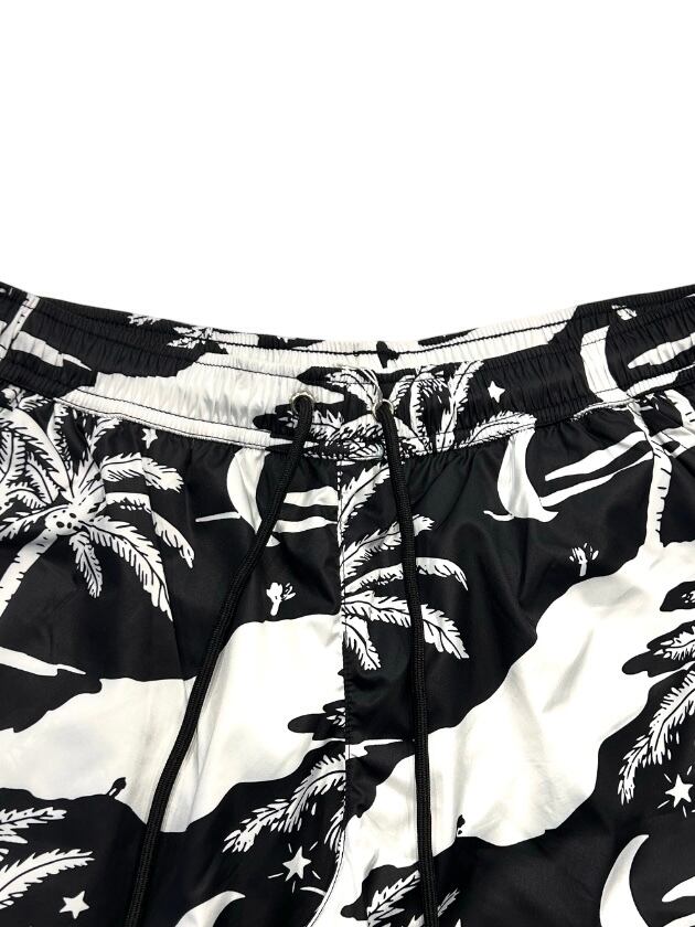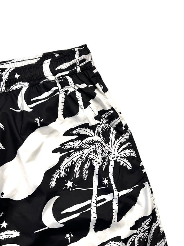夜空に浮かぶ月や星、ヤシの木が描かれた黒と白の総柄プリントです。