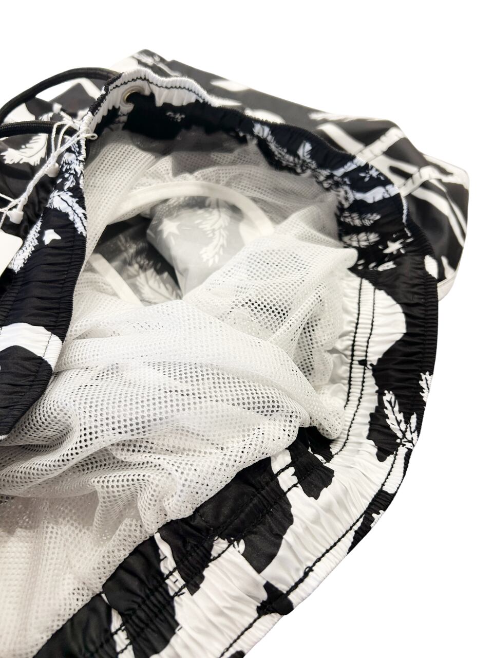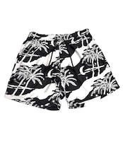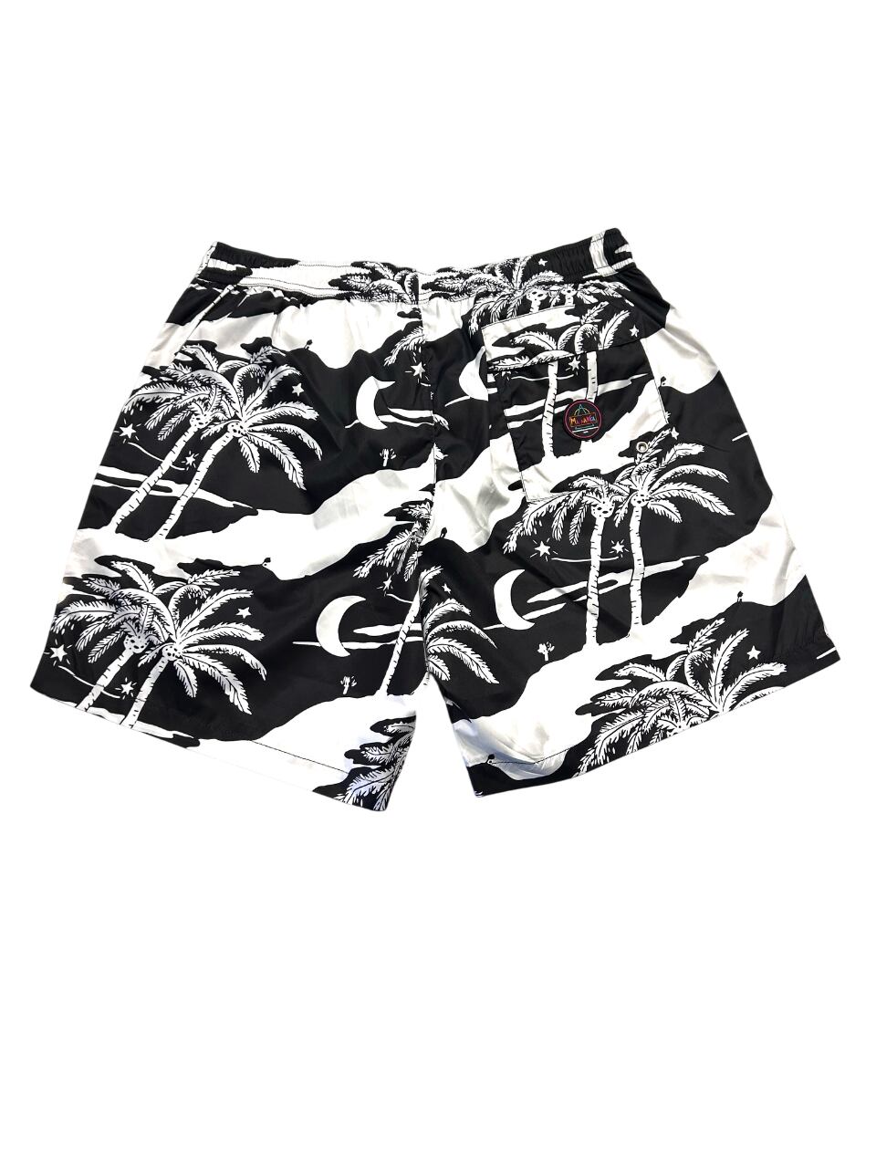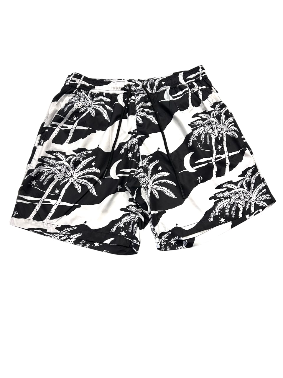 夜空に浮かぶ月や星、ヤシの木が描かれた黒と白の総柄プリントです。