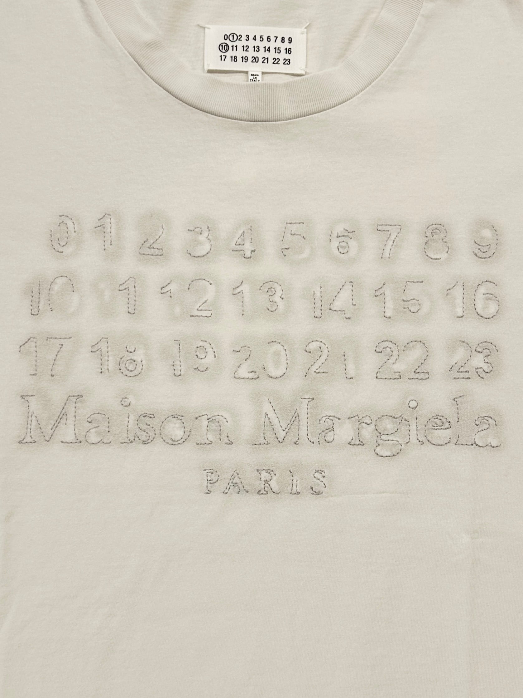 コットン素材を使用したリラックスフィットのTシャツ。ラウンドネックで、フロントのかすれたようなナンバリングロゴ刺繍が特徴的です。バックにはメゾン マルジェラのシグネチャーである4ステッチが入り、その裏側に内ラベルがついています。