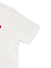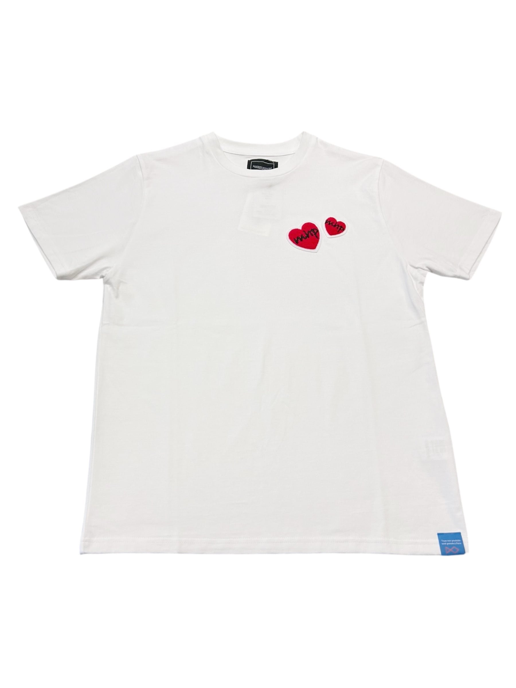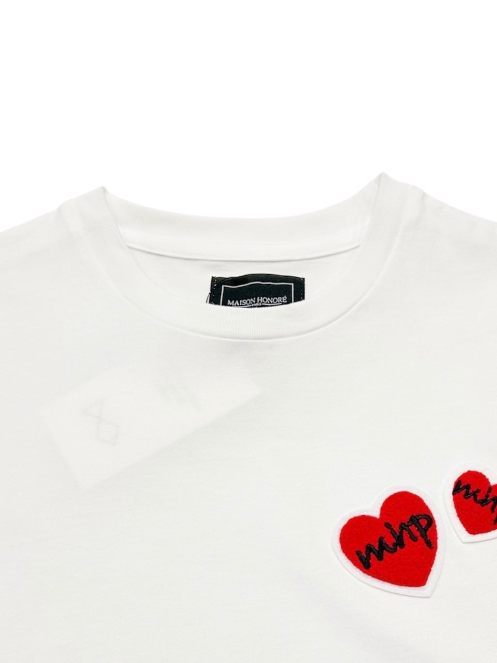 ハートがアイコンのひとつであるココンチから新デザインが登場。大小の赤いハートのワッペンが寄り添うように配置されたTシャツです。大人可愛いデザインで、会話のきっかけにもなるかと。