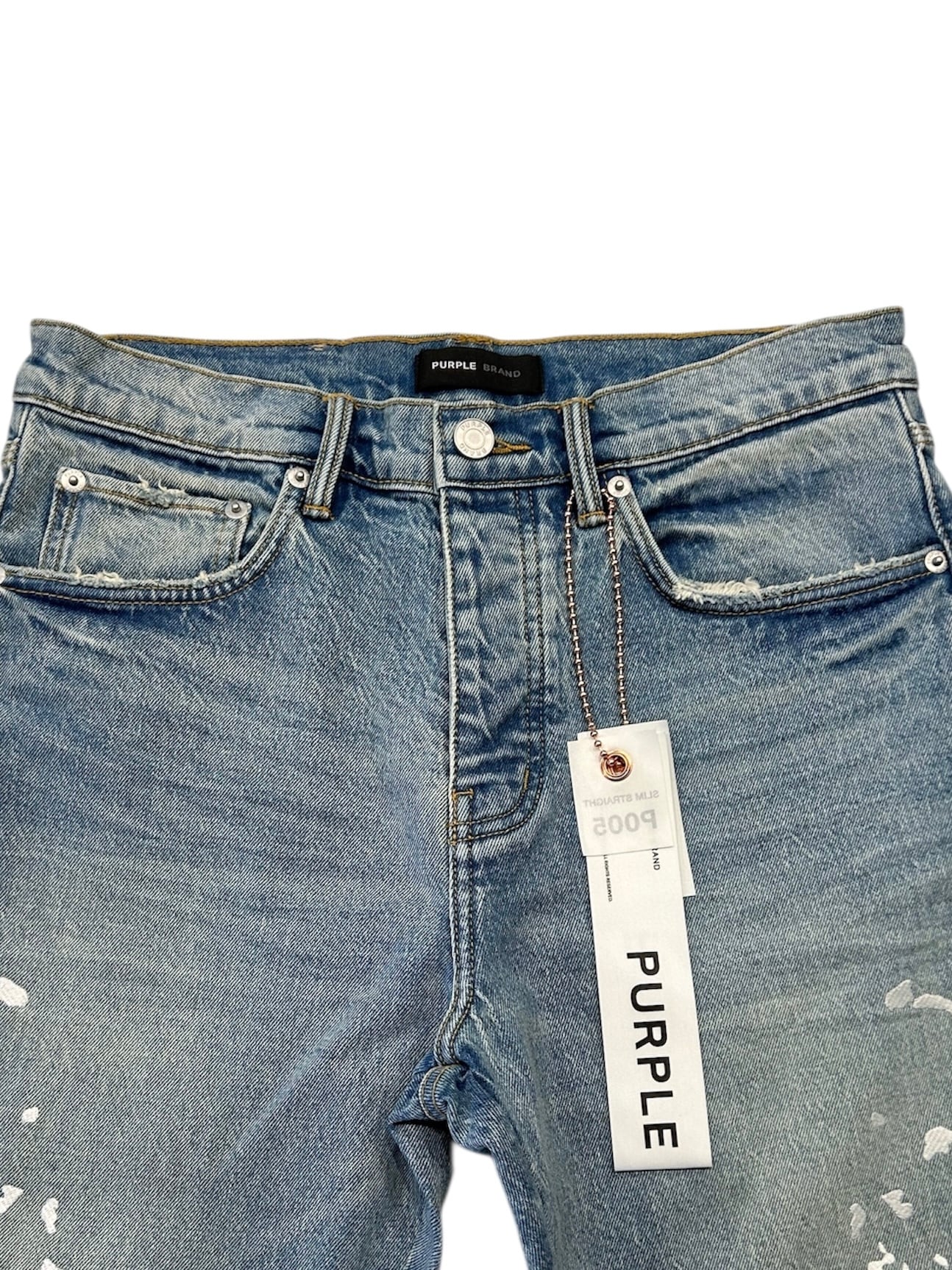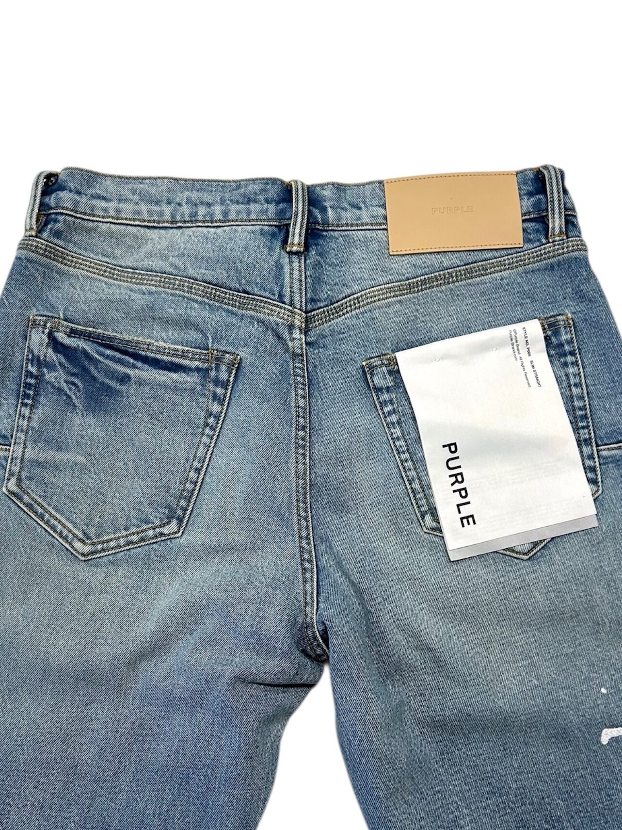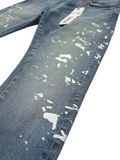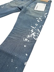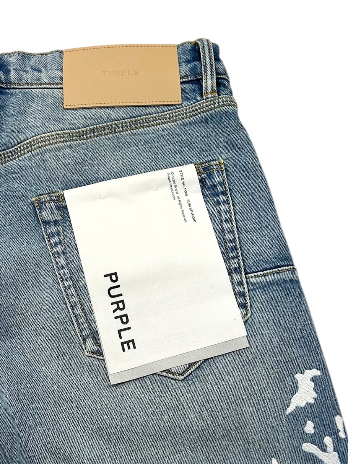 P005は、プレミアムストレッチデニムを使用したミッドライズのメンズジーンズです。クラシックな5ポケット構造。太ももから足首までストレートなシルエットで、ミディアムインディゴウォッシュにペイントスプラッター刺繍が施されています。カスタムメイドのパープルカウハイドレザーパッチ、バックポケットのフラッシャー、そしてロゴ入りハングタグが、ブランドらしさを演出します。