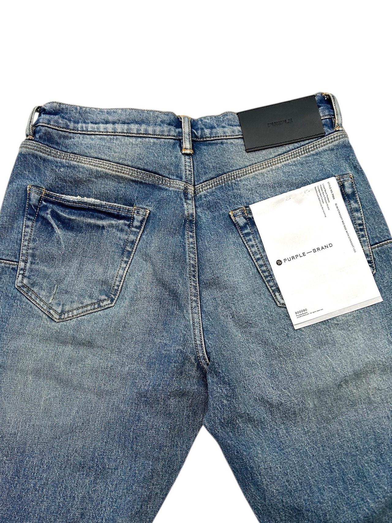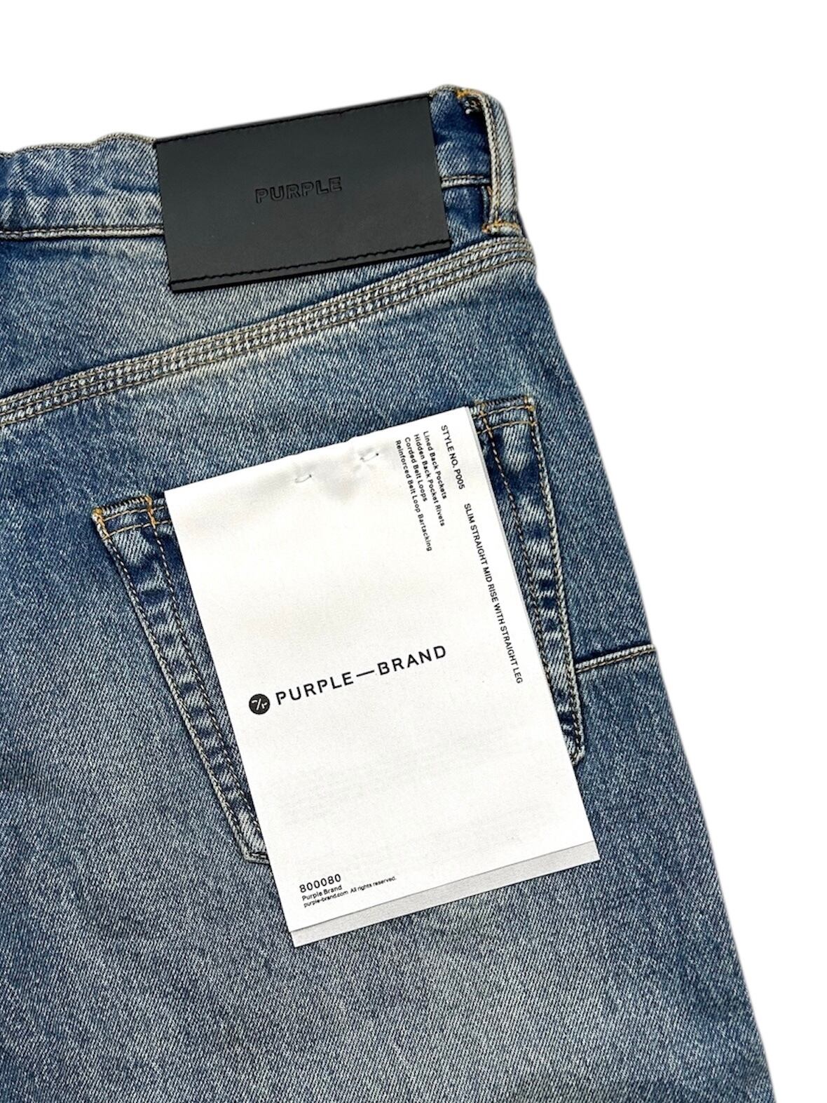 P005は、プレミアムストレッチデニムを使用したミッドライズのメンズジーンズです。クラシックな5ポケット構造。太ももから足首までストレートなシルエットで、ミディアムインディゴウォッシュにペイントスプラッター刺繍が施されています。カスタムメイドのパープルカウハイドレザーパッチ、バックポケットのフラッシャー、そしてロゴ入りハングタグが、ブランドらしさを演出します。