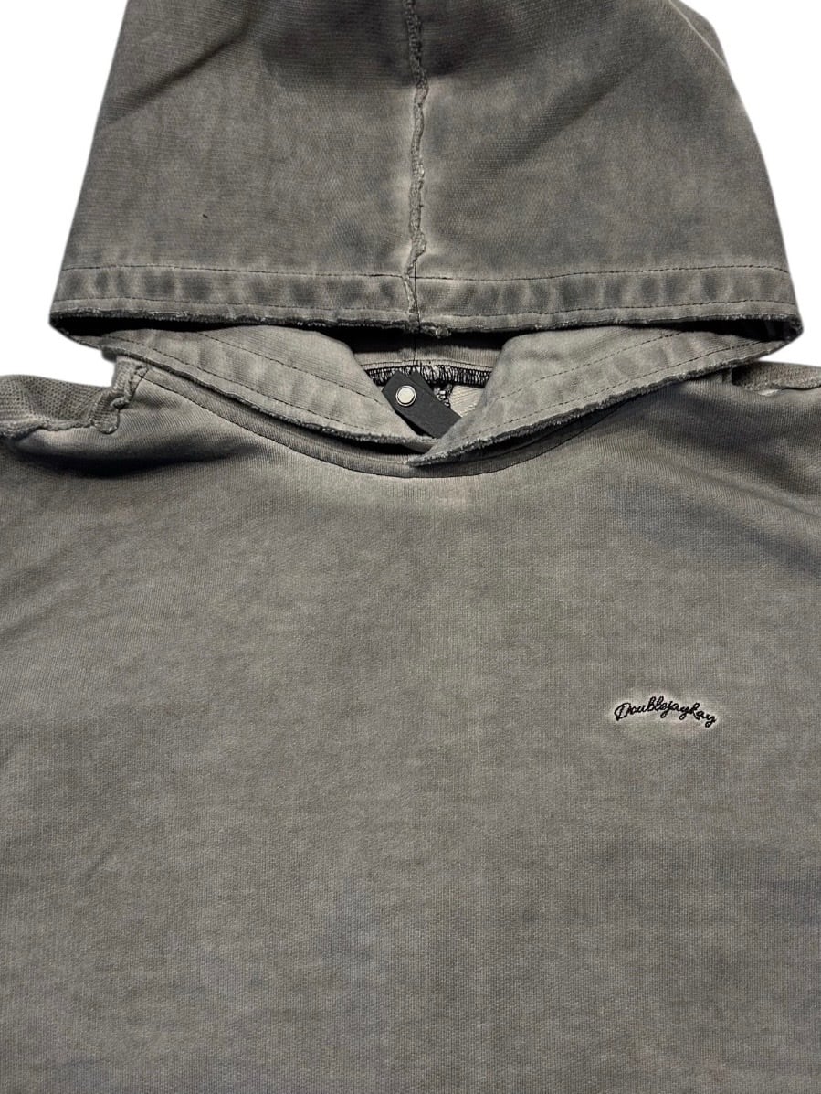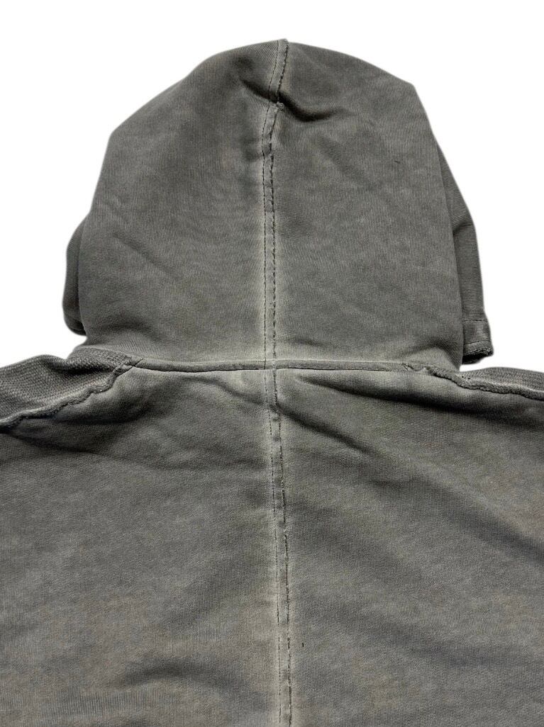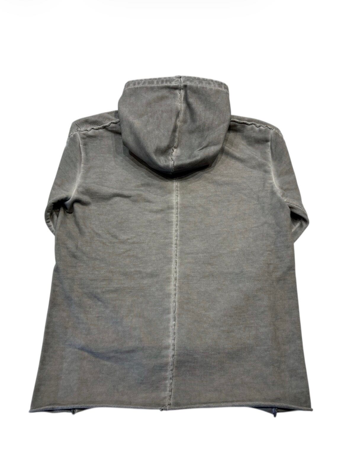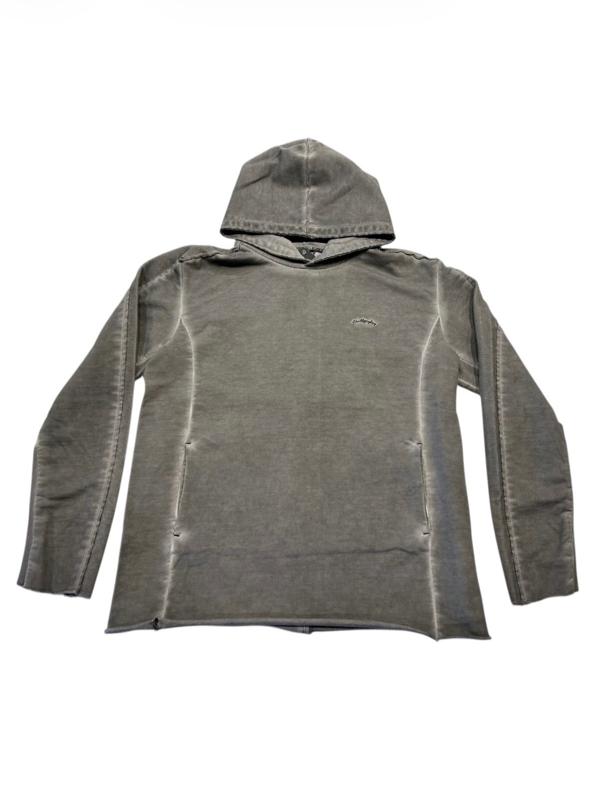 随所の断ち切りで粗野感を演出したプルオーバーパーカー。