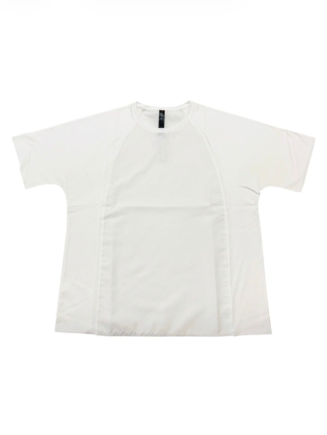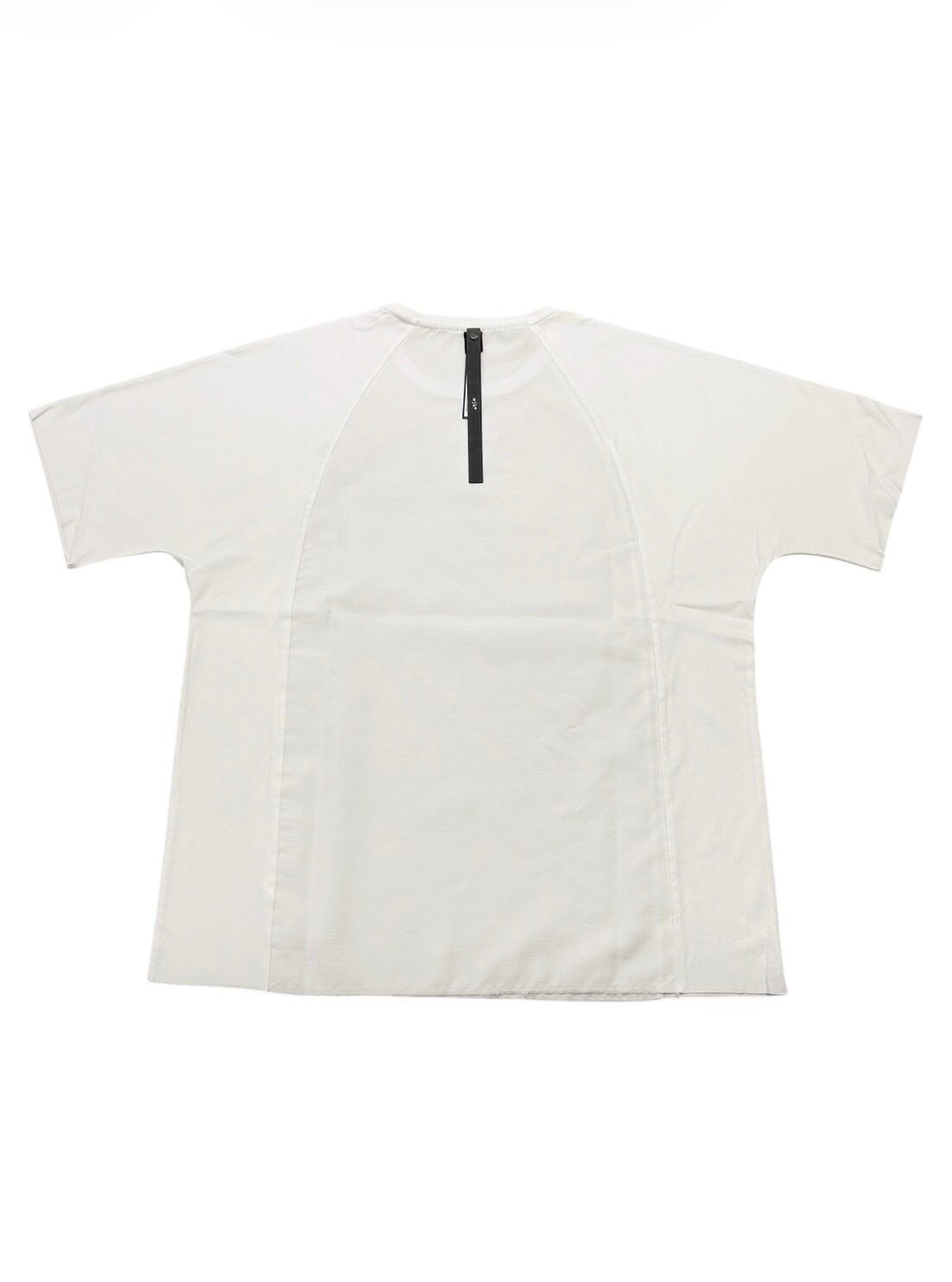 前身、後ろ身には繊細な凹凸によるナチュラルな表情かつ肌離れの良いブッチャー生地を採用。高機能素材「セオアルファ®」を使用しており、吸水速乾に優れ軽量でシワになりにくいため快適に着用でき、かつ上品な風合いをキープしてくれる。