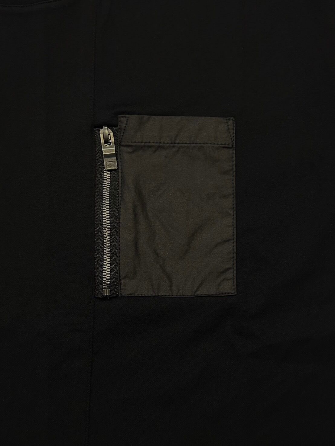 縦に大きく走るシームラインが特徴のポケT。ポケットにファスナーを配することでアクセントを加えている。高機能リバーニットをかけあわした、夏場に最適な一着。